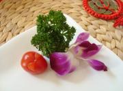 盘边用兰花、香菜和圣女果切成的兔子装饰。