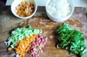 泡菜,青菜,胡萝卜,烤肠全部切成小粒备用。