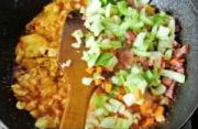 加入青菜烤肠胡萝卜翻炒出香。