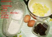 巧克力体:普通面粉50g,白糖80g,盐少许,全蛋2个(带皮150g),黄油110g,黑巧120g。