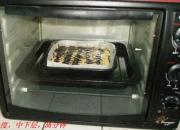 把2大勺巧克力糊淋在奶酪上,用牙签划出花纹(最好把巧克力糊放裱花袋里挤会好看些)。