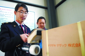 昨日,宁夏出入境检验检疫局的工作人员正在银川市河东机场特殊库内对从日本进口产品进行核辐射监测。新华社记者 彭昭之 摄