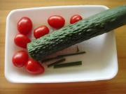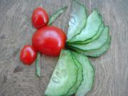 取圣女果切片做鱼身,鱼眼;黄瓜切片做尾,鳍摆出小金鱼造型。