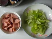 将尖椒切成块,火腿切成四分之一的样子。