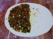 将肉馅涂抹在薄饼的一半位置,均匀铺满,边缘少留空。