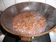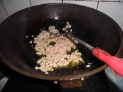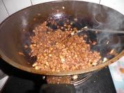 倒油,如果是五花肉就少倒点油,葱姜蒜爆香,放干淀粉腌后的肉丁,翻炒。
