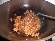 炒出香味后,倒入切好的茄子丁,翻炒。