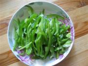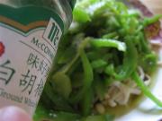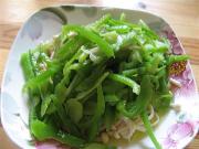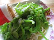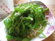 葱切丝,油热后,放入葱丝、青椒段炒香,加入香菜翻炒几下,关火。