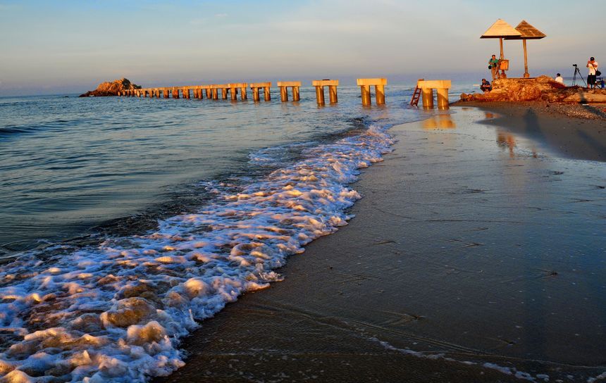 海岸朝晖。红牛帐篷节第二天早上,一缕晨光照在岸边的残桥、小亭上,显现一种诱人的红色。