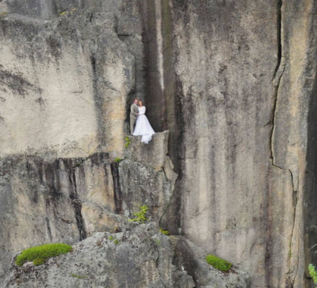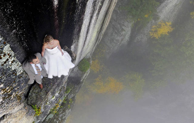 美国一对夫妇在悬崖绝壁之上拍摄了一组史诗般的婚纱照。100米的高空之中,新娘凌空独立,把生命托付在爱人手中。此等爱与勇气,令观者为之动容。