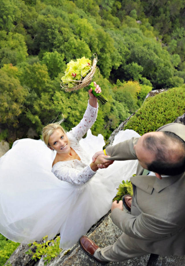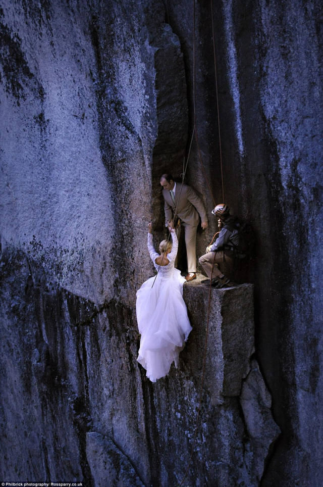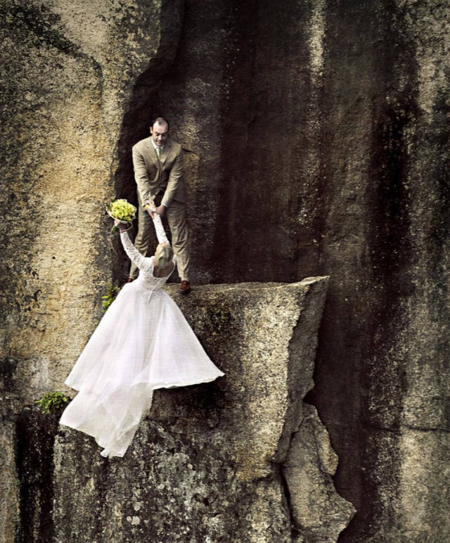 为了完成这组照片,摄影师用绳索将两人从山顶降至离地100米的山间平台。这对勇敢的新人在空中崖壁之上进行拍摄。