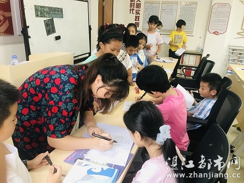 书法班老师认真的教孩子们遵循“字形大小结构、重心章法”的特点练书法。
