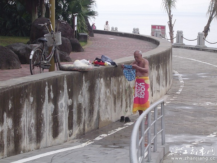 12月14日上午的金沙湾,蓝天白云,碧海银沙。有两老伯从海中游泳回来,就在众目睽睽下更换衣服,行人纷纷侧目!两老伯行为正如给金沙湾这美丽的画卷上泼了一盘污水。