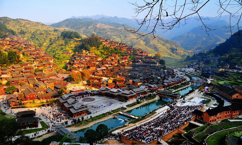 肇兴侗寨是黔东南侗族地区最大的侗族村寨,也是侗族的民俗文化中心。这里四面环山,寨子建于山中盆地,两条小溪汇成一条小河穿寨而过。
