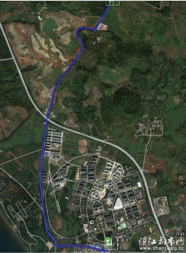 广东海洋大学校门→湖光岩东大门右转→广东海洋大学后小路→疏港大道桥底涵洞→信鸽中心大门左转→汽车训练场→训练场指挥瞭望亭