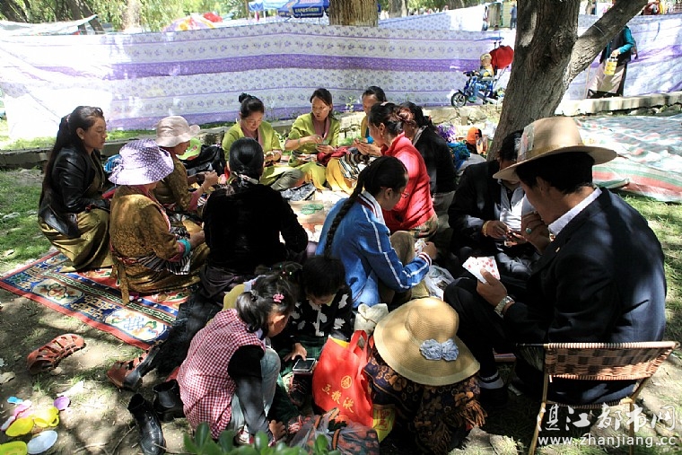 雪顿节那天,我们进入罗布林卡,只见里面人潮如涌,树木下、草丛中,藏胞们搭上帐篷,席地而坐,摆上青稞酒、酥油茶、牦牛肉干和大饼等各种食物,这就是藏胞的“过林卡”。
