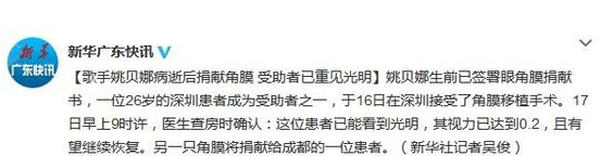 @新华广东快讯 微博截图@新华广东快讯【歌手姚贝娜病逝后捐献角膜受助者已重见光明】姚贝娜生前已签署眼角膜捐献书,一位26岁的深圳患者成为受助者之一,于16日在深圳接受了角膜移植手术。17日早上9时许,医生查房时确认:这位患者已能看到光明,其视力已达到0.2,且有望继续恢复。另一只角膜将捐献给成都的一位患者。(新华社吴俊)
