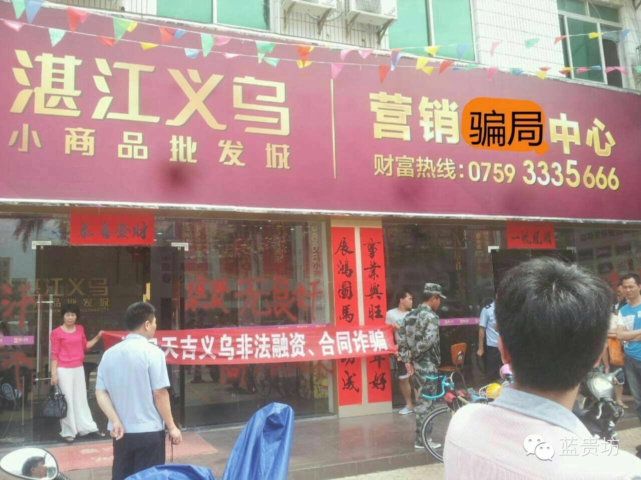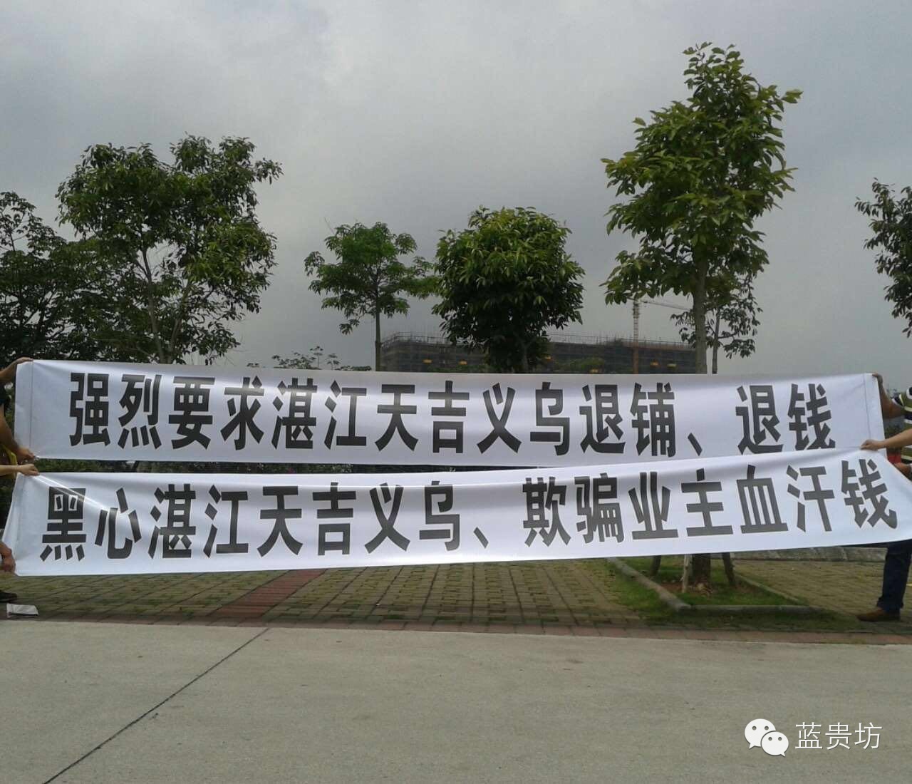 终于到了5.1,项目公司果然打出了“湛江天吉.义乌小商品批发城收铺暨开业”的横幅。说到这里可能大家也已发现,之前的“湛江海田.义乌” 怎么就变成了“湛江天吉.义乌”了呢?在此咱们暂且不管,来看看收铺开业情况。当天赤坎政府个别领导也亲临现场,现场载歌载舞,加上是5.1假期,场面还算红火。但收铺的商户廖廖无几,因为大家都看出了些问题。一是该返还的租金没有返还;二是商铺工程还没有完成。一、二楼中央空调没安装,铺位吊顶、部分玻璃门、大门等等都没有装好。三、四楼空空如也,啥都没搞,只是一个空壳。这些问题都在困惑着商户。然而更让人感到意外的是,部分一楼的商铺项目公司称因消防通道问题,根本就没有建,也就是说来收铺的一小部分一楼的商户拿着合同根本就没有铺。另外,有两个商户同时来收同一间商铺。这两个突发的消息,就像原子弹一样突然在商户们当中炸开了!此时商户们就像上的蚂蚁,急成一团,忍耐性也基本达到了极限,开始集中到项目公司讨说法。项目公司的答复是:没有商铺的商户在5月12日前可退铺,并当场给商户们写下了《承诺书》;个别一铺多租的问题是公司员工程序操作混乱造成,会及时处理。