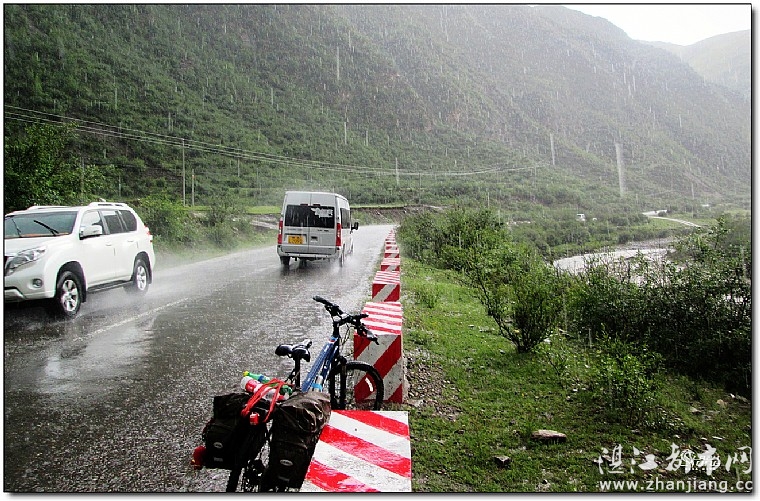 7月初的318阳光明媚,当地人都说今年雨水来的晚,迄今都没有下过几场雨,骑车进藏的车友比比皆是。和几个江西的车友边骑边聊着,只见眼前的山峰不知不觉的挂上了黑压压的乌云,前方开始下雨了,赶紧把雨衣雨裤穿整齐,再用塑料袋把鞋和脚一块套上绑实,防水手套刚戴好,大雨携着狂风夹杂着冰雹喷薄而至,周围山河飘摇黑沉沉的一片仿佛怪巨型怪兽降临一般,渐渐的觉得身体也非常的冻,赶紧拿出热水瓶倒上一杯热开水灌了了下去,顿觉全身心暖暖的,山路两旁无房无棚,避无可避,干脆掏出相机和着风雨和砸在头盔噼啪作响的冰雹跳起强劲的迪斯科,大巴车上的乘客一定会以为遇到疯子了。