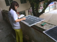 课堂正式开始时,何老师在小黑板上准备了几组英语词汇,何老师把这两块黑板挂起来,让孩子们能够看得清楚。