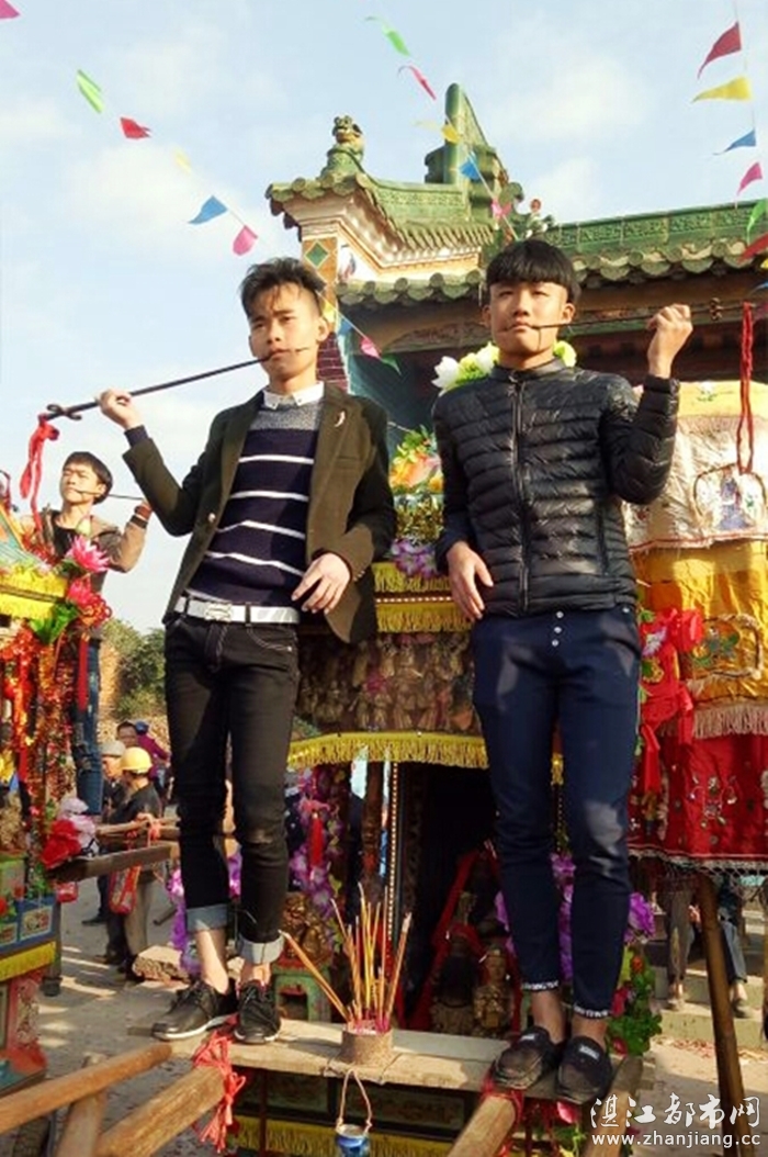 据了解,“穿令箭”是广东湛江各地乡村巡游表演的一项汉族民俗绝技,就是在年例游神时,把一支4-5斤重的大铁针从人体的每个部位穿过。一般情况下都是从嘴两傍穿过,但只能是村里的男性,从几岁、十几、二十九、三十几、至六十岁的男人都可以参加“穿令箭”的。不可思议的是:他们“穿令箭”时不会感觉到有痛楚,也不流血,游神完了时,把令箭拨出来,用些香灰擦在穿令箭的伤口上,伤口立刻完好如初,和平常人一样了,非常神奇!