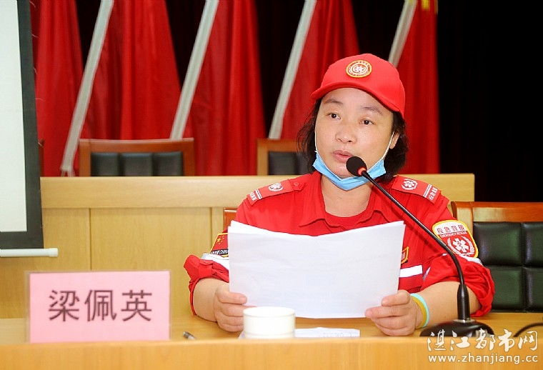 当天下午,湛江市志愿服务联合会常务副会长、湛江市情暖湛江志愿者协会会长梁佩英主持成立仪式。梁会长介绍社区志愿者救援队是一个基层组织,通过吸引社会各部门的参与,来增强社会的安全,提高社区的备灾能力。她还介绍社区志愿者救援队的定位、原则、特征、核心工作和队伍组织结构,说明救援队伍的志愿性质,并强调安全是第一原则。