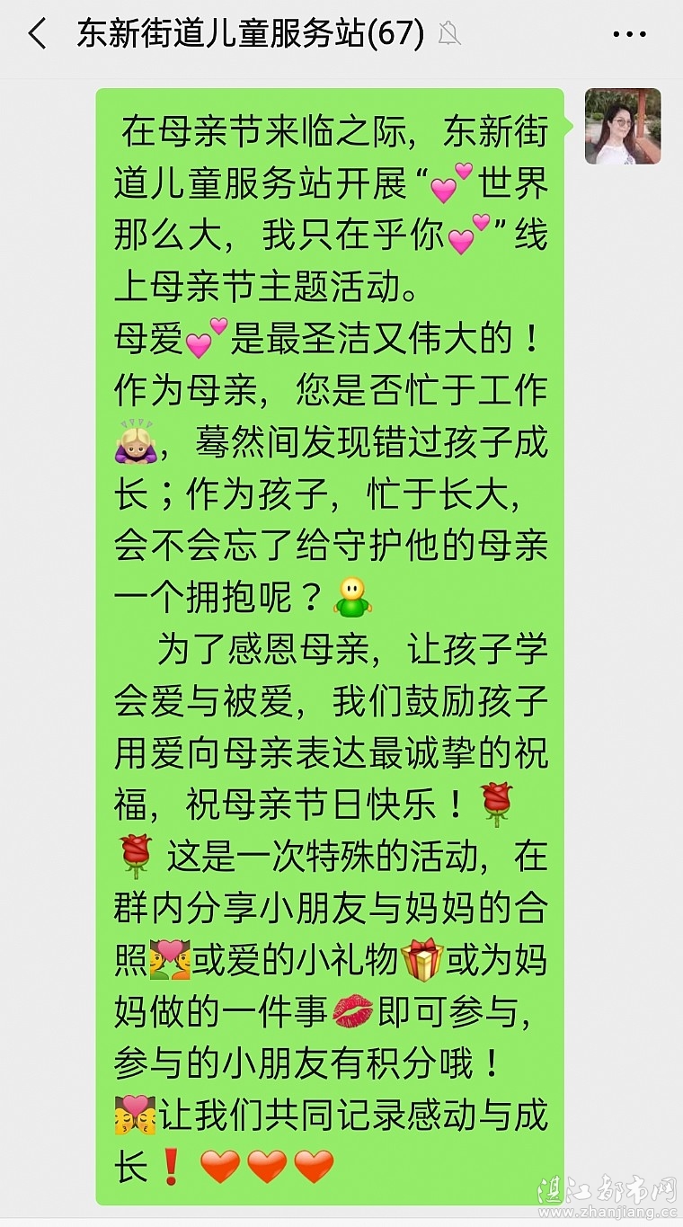 从孩子呱呱坠地的那一刻起,您便多了一个爱的称呼:母亲。天下间,便再也不会有任何人给予我们如此盛大永无止息的爱和恩慈,再也不会有这样心甘情愿,只为那个您日日牵挂的孩子。母爱,圣洁而伟大。但是,母亲啊,您是否忙于工作,随着孩子长大,蓦然发现错过孩子成长的瞬间;而作为孩子却忙于长大,而忘了给守护着他的您,一个拥抱呢? 为了感恩母亲,让孩子学会爱与被爱,为亲子提供一个沟通、交流的平台,促进母子、母女之间的和谐交流,2020510日,壹基金儿童服务站(东新街道站)联合湛江市壹基金儿童服务站多个站点、湛江市霞山区东新街道,湛江市霞山区东新街道党群服务中心,湛江市东新社区湛江市东新街道解放西社区家长学校以及湛江市情暖湛江志愿者协会,共同开展世界那么大,我只在乎你母亲节主题活动。让小朋友分享与妈妈的合照或为妈妈做的小礼物或为妈妈做的一件事即可参与活动。考虑到现仍处于疫情期间,本次活动主要采取线上与线下相结合的方式开展活动。