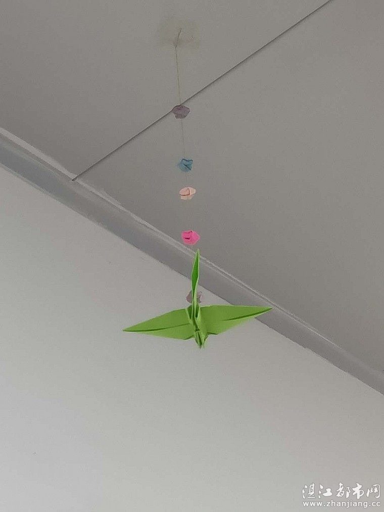 我们两位专职给孩子们剪出不同颜色的卡纸,一双双小巧的小手折出了不同颜色不同形状的‘千纸鹤’和‘青蛙’最后用针线把它们和星星串起来挂在天花板上面。我们的站点的天花板瞬间挂满了五颜六色的星星 ‘千纸鹤’‘青蛙’。