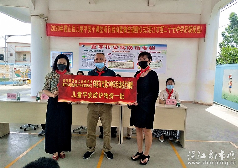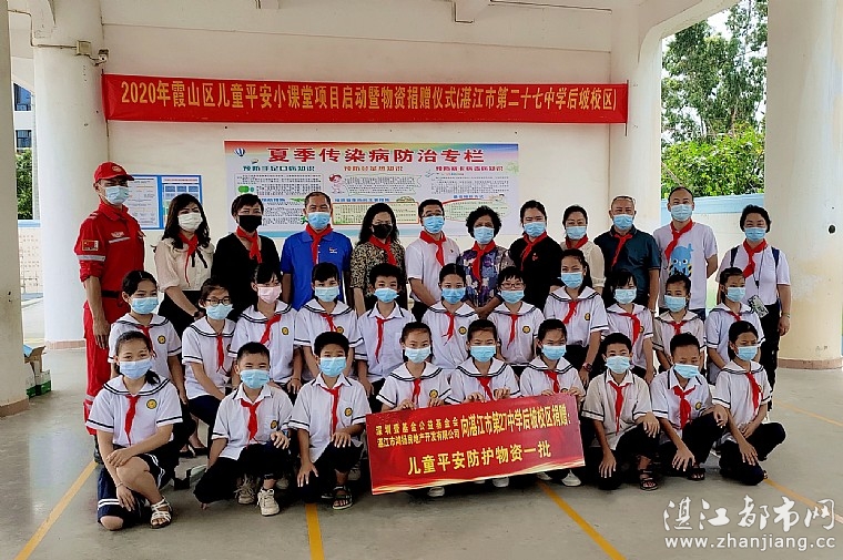 湛江都市网讯(图:梁彩霞/文:燕燕):6月5日,共青团湛江市霞山区委员会、湛江市霞山区志愿服务联合会、深圳壹基金公益基金会、英德市亮石志愿者协会、湛江市鸿扬房地产开发有限公司、湛江市情暖湛江志愿者协会和湛江市情暖湛江志愿应急救援队在湛江市第二十七中后坡校区,联合举办2020年霞山区儿童平安小课堂项目启动暨物资捐赠仪式。共青团湛江市霞山区委员会书记陈立、共青团湛江市霞山区委员会副书记邓颖鸿、湛江市霞山区志愿服务联合会会长林永英壹基金广东协调机构协调人、共青团英德市委员会兼职副书记、英德市亮石志愿者协会会长陈观霞、英德市亮石志愿者协会救灾专岗、项目主任黄伟,湛江市志愿服务联合会常务副会湛江市情暖湛江志愿者协会会长梁佩英湛江市霞山区少先队总辅导员钟晓婷、湛江市第二十七中学校长洪杰湛江市第二十七中学党支部书记段钦湛江市鸿扬房地产开发有限公司代表郭朝霞等领导嘉宾以及二十七师生代表参加本次项目启动暨物资捐赠仪式。