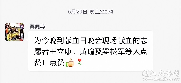 当晚,湛江市志愿服务联合会常务副会长、湛江市情暖湛江志愿者协会会长梁佩英、湛江市情暖湛江志愿者协会副会长黄文春和13名情暖湛江志愿者参加本场表彰晚会。情暖湛江志愿者黄瑜、王立康和梁松军无私奉献,于晚会现场无偿献血。晚会结束后,梁佩英会长在各个情暖湛江微信群里通报表扬黄瑜、王立康和梁松军的仁心义举。