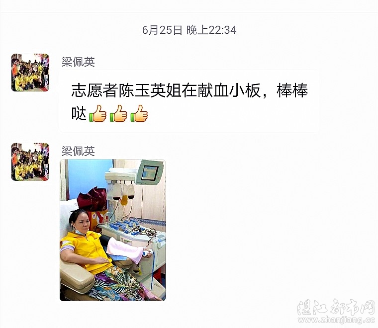 625日,情暖湛江志愿者陈玉英到赤坎区步行街血站捐血小板。梁会长也在各个情暖湛江微信群里通报表扬陈玉英,并为她点赞。