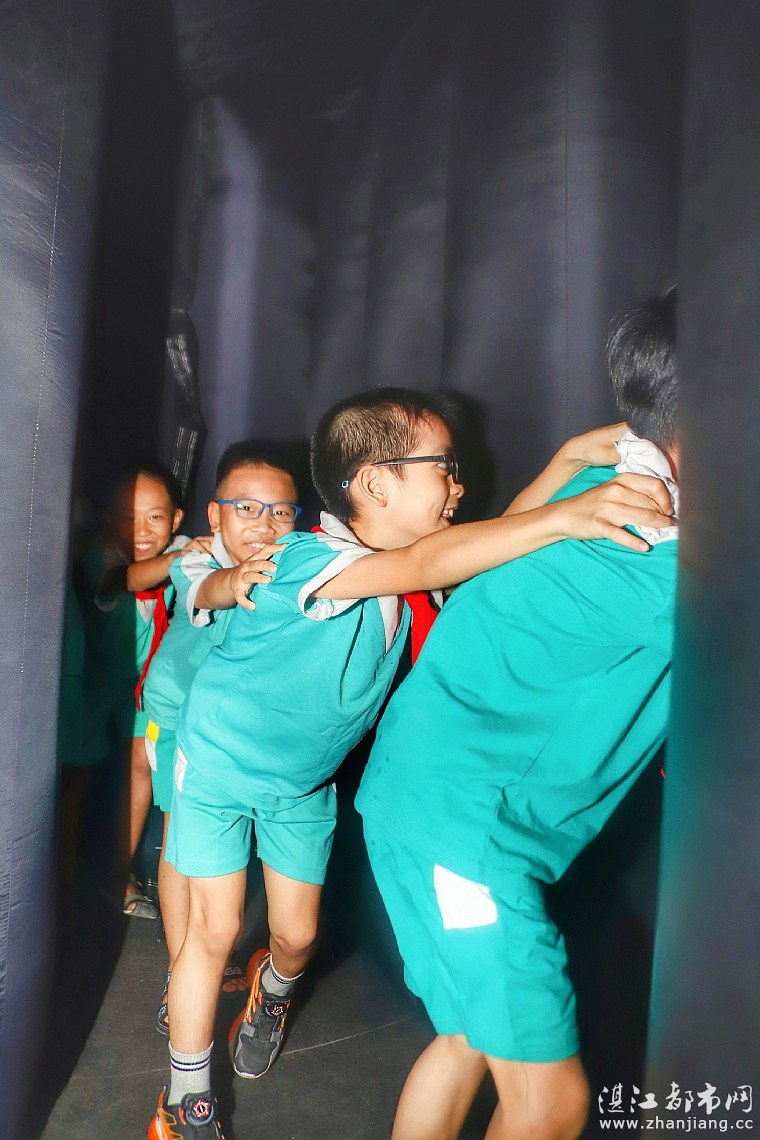 当天中午,情暖湛江志愿者、志愿应急救援队员和公益讲师提前到达市十二小,搬运消防安全体验课物资,搭建消防烟雾逃生体验馆,作课前准备。下午2时50分,二年级同学们按照班级的顺序,来到消防烟雾逃生体验馆前列队。公益讲师首先给同学们做模拟火灾现场的心理辅导,示范火场逃生的方法与自救技巧。接着,公益讲师谢文杰、赵润生分别带队,同学们以4人、5人、6人为一小组,手搭着肩膀,进入消防烟雾逃生体验馆,体验模拟火场逃生。两名情暖湛江志愿者分别站在入口处、出口处协助维持秩序、清点人数,确保同学们的进入人数与出来人数相符,安全、快乐地掌握模拟火场逃生的技能。