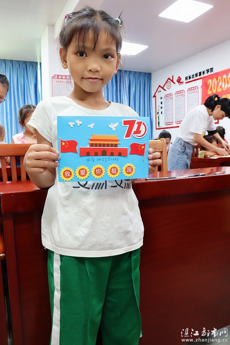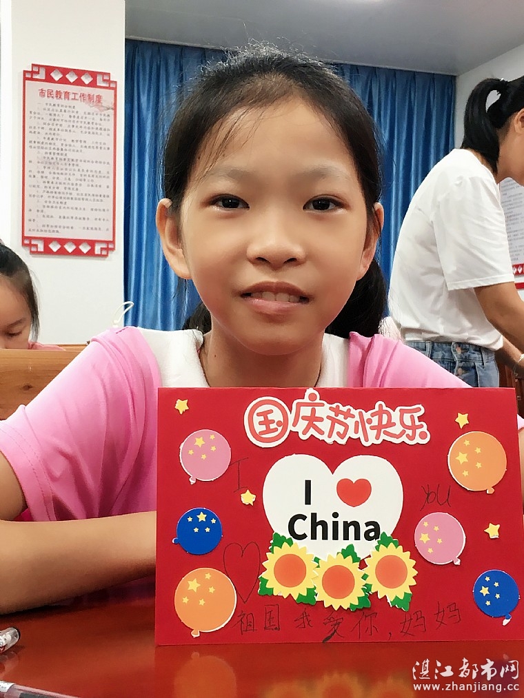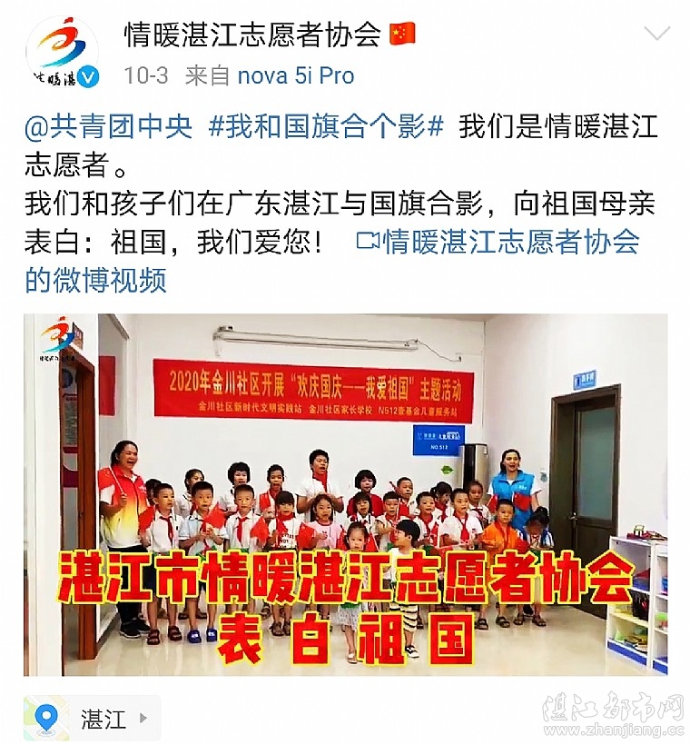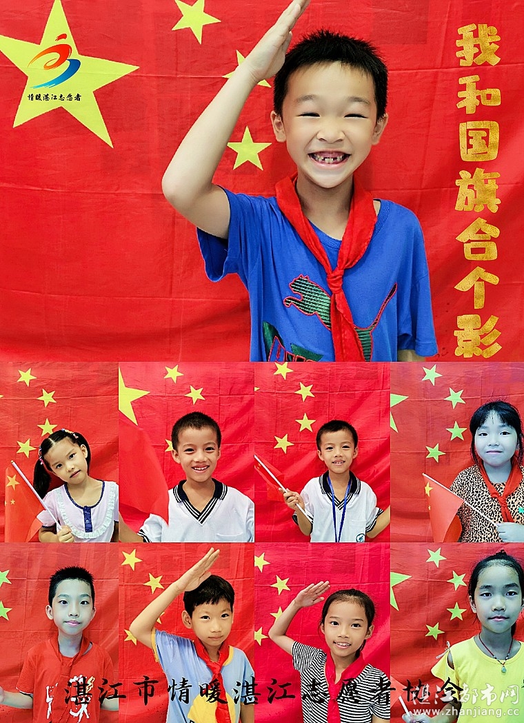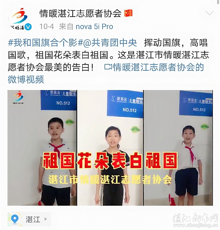 “祖国,我们爱您!祝您生日快乐!”11个儿童服务站专职人员、情暖湛江志愿者分别邀请家长,带着孩子们一起与国旗合影,共同表白祖国。双节同庆,湛江市情暖湛江志愿者协会在微博、微信、微视、B站、抖音、快手和湛江都市网等平台表白祖国,庆祝祖国71周年华诞,凝聚赤子之心,弘扬爱国之情,砥砺爱国之志,使爱国成为我们的精神力量与自觉行动。
