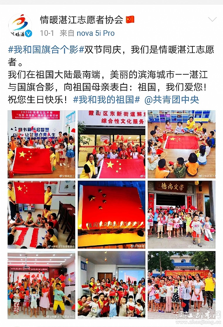 湛江都市网讯(图 儿童服务站专职/文 燕燕于飞):2020年9月29日, 共青团中央在微信公众号发布《爱国就要晒出来!我和国旗合个影,一起表白祖国》。湛江市情暖湛江志愿者协会积极响应团中央号召,联合霞山区、麻章区、遂溪县11个壹基金儿童服务站开展“我和国旗合个影,一起表白祖国”活动。