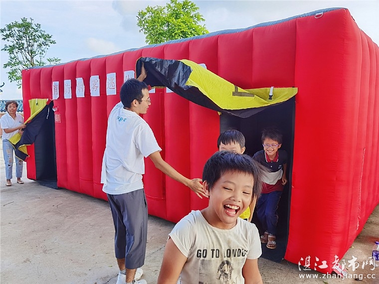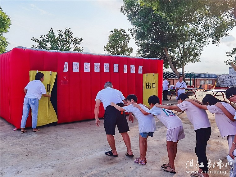 进入消防烟雾逃生体验馆前,公益讲师示范屈膝、弯腰、搭肩膀等火场逃生的方法与自救技巧,讲解注意事项。接着,公益讲师轮流带队,同学们手搭着肩膀,进入体验馆体验模拟火场逃生。两名情暖湛江志愿者分别站在入口处、出口处协助维持秩序、清点人数,确保同学们的进入人数与出来人数相符,安全、快乐地掌握模拟火场逃生的技能。