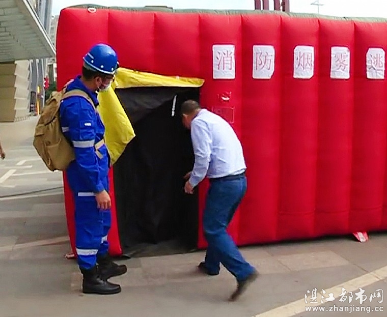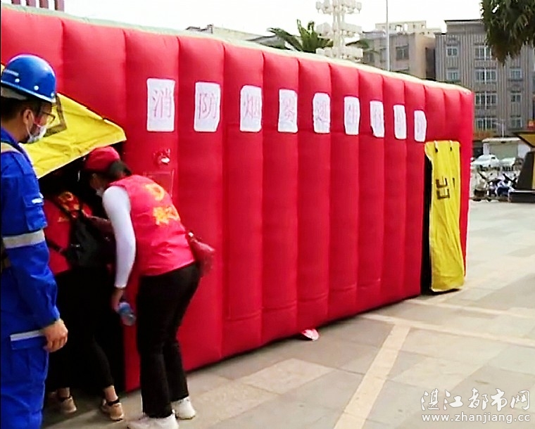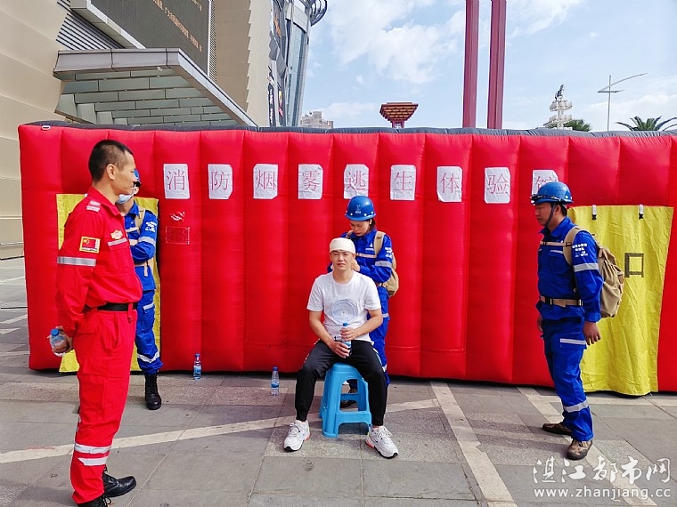 在情暖湛江志愿应急救援队教官和遂溪县社区志愿者应急救援队员的指导下,市民朋友走进消防烟雾逃生体验馆,体验模拟火场逃生,学习止血包扎和简单急救处理。社区志愿者应急救援队员派发消防安全知识宣传单,向市民朋友宣讲消防安全知识。