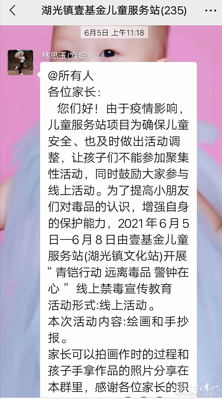 为了提高少年儿童对毒品的认识,增强自身的保护能力。2021年6月5日-6月8日由麻章区委、区禁毒办、湖光镇团委、湖光镇禁毒办、湖光镇创文办、湛江市情暖志愿者协会、徐闻县献爱心志愿者协会、N516壹基金儿童服务站(湖光镇文化站)联合开展“青铠行动 远离毒品 警钟在心”线上禁毒宣传教育活动。