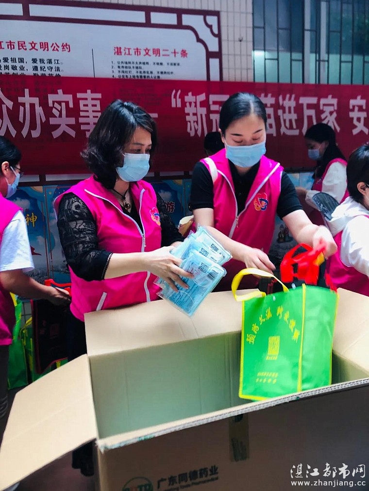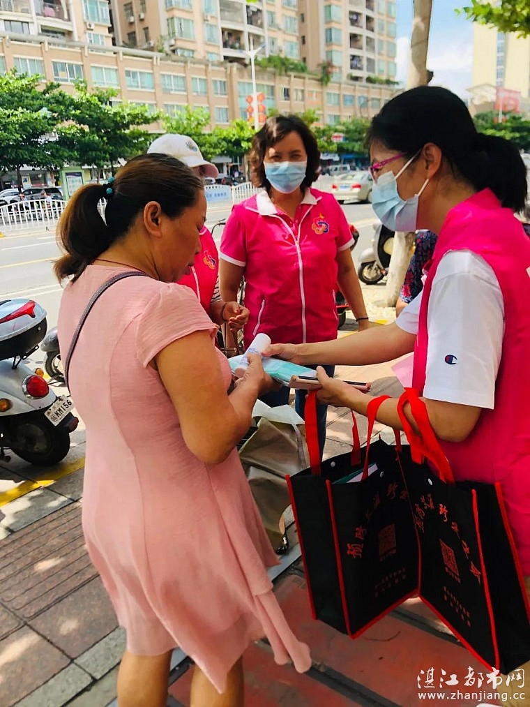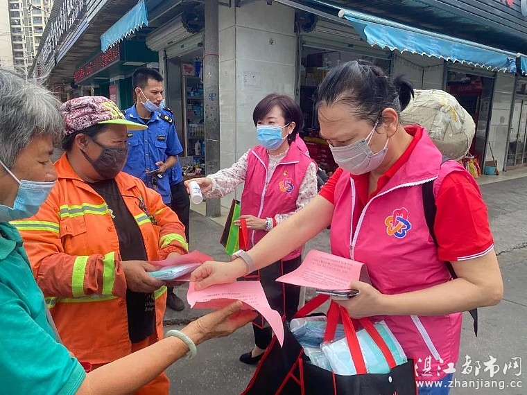 湛江都市网讯(图/文 湛江市女企业家秘书处):疫情就是命令,防控就是责任。6月6日以来,湛江吴川疫情形势严峻复杂,牵动着湛江人民的心。为战胜疫情,湛江市女企业家协会尽一份巾帼之力。6月11日上午,湛江市妇联党组书记、主席陈翔同志带领着妇联干部,与广东同德药业有限公司董事长、湛江市女企业家协会会长周小萍带领协会会员姐妹一道,迅速组成一支30多人的巾帼志愿者队伍,分别在霞、赤两地为广大市民免费派送同德药业捐赠的一批医用口罩和消毒酒精,并向市民派发防疫、抗疫宣传单。