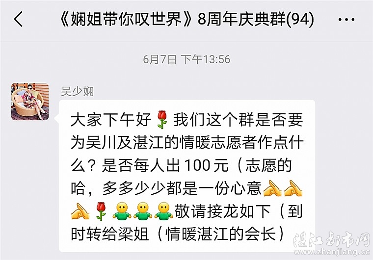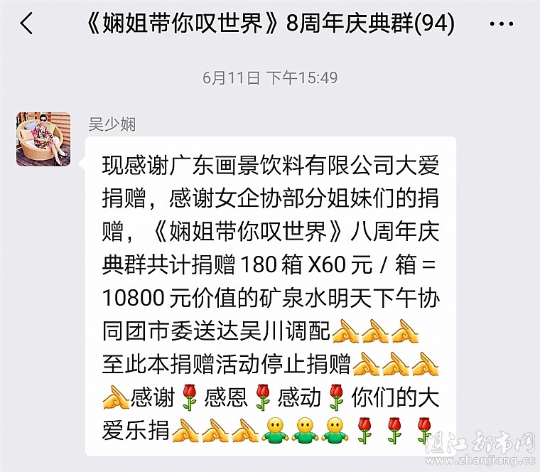 66日起,“情暖湛江”一直关注吴川防疫前线,持续向外界发出紧急募集防疫物资支援吴川呼吁,并得到情暖湛江”爱心大使、公益合作伙伴、爱心企业和爱心商家的积极回应6月7日,“情暖湛江”爱心大使吴少娴(大家亲切地称她为“娴姐”)在《娴姐带你叹世界》8周年庆典群号召大家为吴川出力,得到53位微友的积极响应,纷纷乐捐。6月11日,娴姐将微友们善款转账给广东画景饮料有限公司经理温连芳购买画景矿泉水。画景公司也捐赠买一送一,与《娴姐带你叹世界》8周年庆典群共同捐出价值10800180画景矿泉水,而且还于12日派车运送第三批防疫物资。