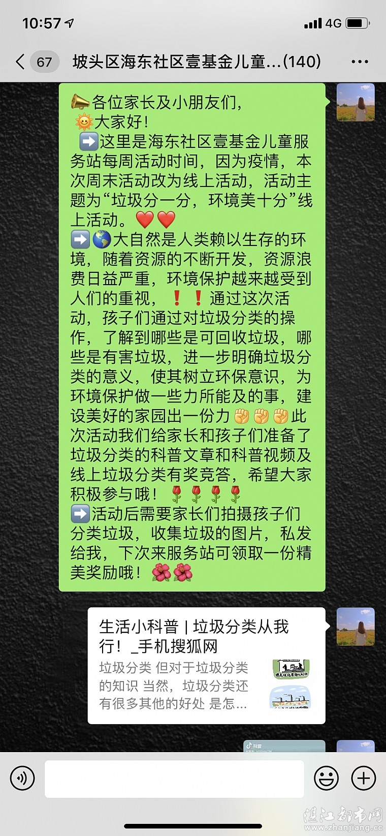 志愿者老师在家长群发布了垃圾分类的学习文章和科普视频供大家学习,最后用有奖竞答的方式检验了大家的学习成果,大家都积极抢答,答案准确,最后志愿者老师收到了家长们发来的孩子们分类垃圾,打扫卫生的图片。