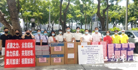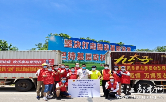 2021 年 6 月 16 日上午,共青团湛江市委员会、湛江海关、金海象(广东) 影业有限公司(湛江分公司)、湛江小脚印托育服务有限公司等单位共同捐赠的第四批医疗物资及生活物资已专车送达,其中包括凉茶 50 箱、八宝粥 150 件、饮用水 350 箱、医用外科口罩 10000 个、医用手套 4000 对,各方力量联合起来为吴川加油,情暖湛江志愿者在此为在吴川防疫一线的青年志愿者们致敬。
