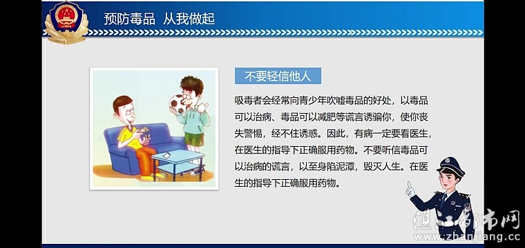 本次活动由湛江市禁毒委员会采用线上直播授课形式,通过授课进行多样化的禁毒互动宣传,让大家亲自参与到禁毒行动当中,将健康人生、绿色无毒的理念根植于心。此次活动内容丰富,通过介绍什么是毒品、什么是吸毒、新型毒品的种类、毒品的危害、如何预防毒品、毒品的相关法律等来提高孩子们的识毒拒毒的能力。