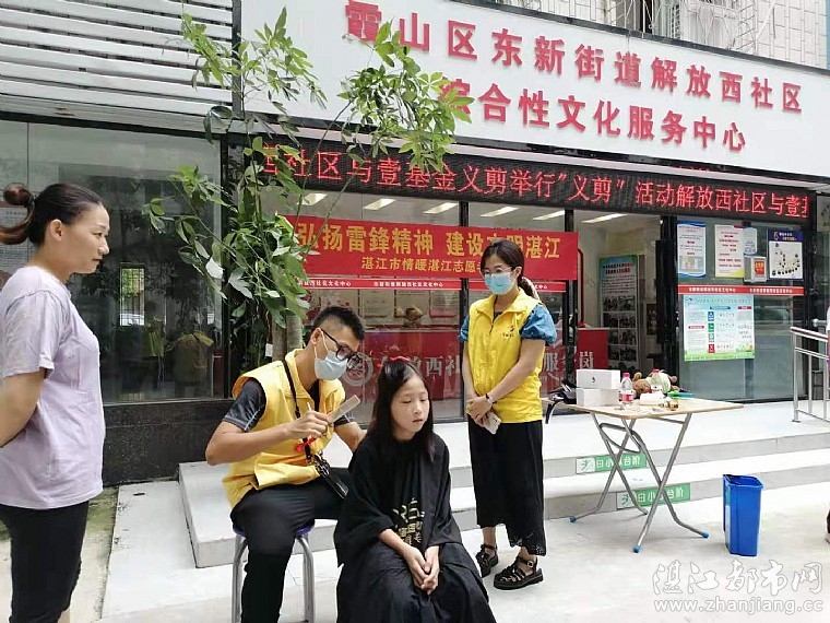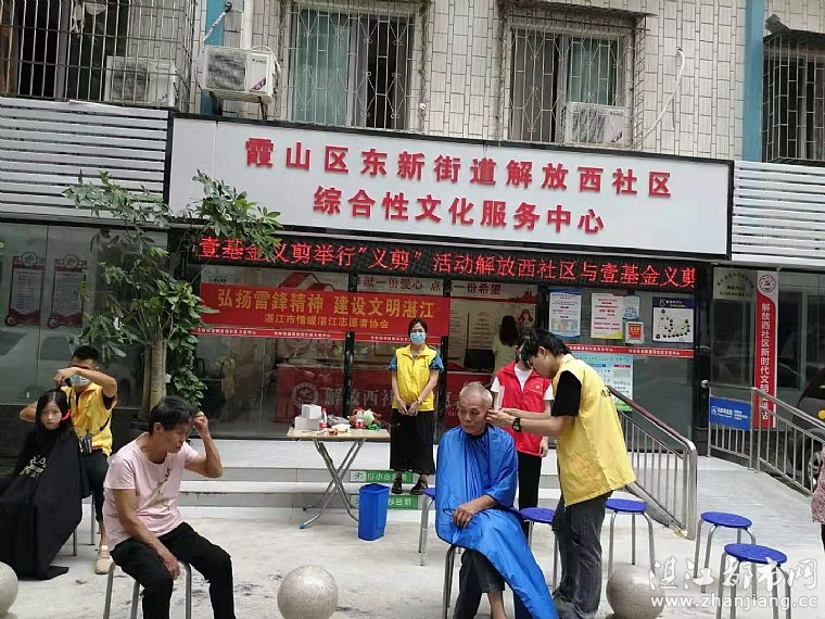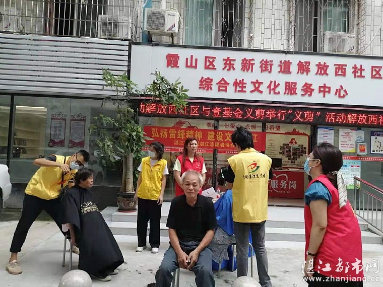 为了促进社区和谐,建设湛江美好社区,情暖湛江志愿者协会在东新街道解放西社区举办义剪活动,免费为解放西社区的居民剪头发,为群众办实事弘扬雷锋精神,建设文明湛江!