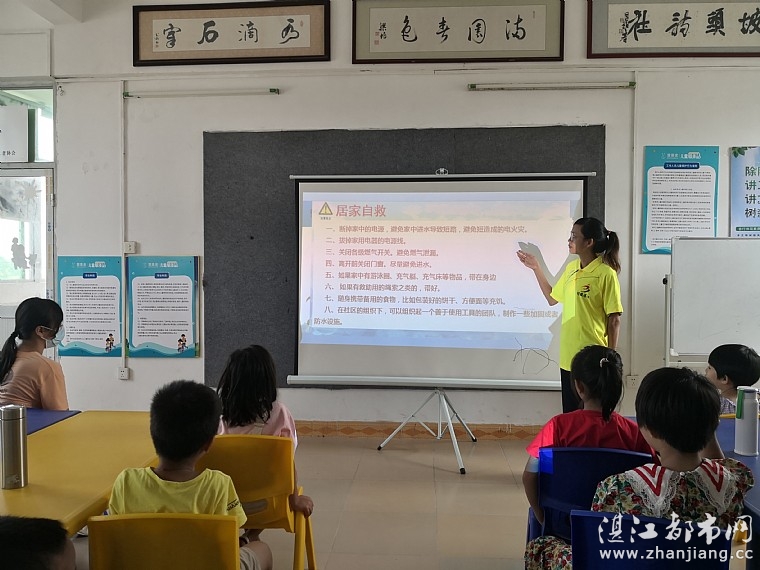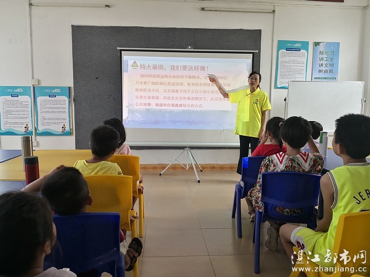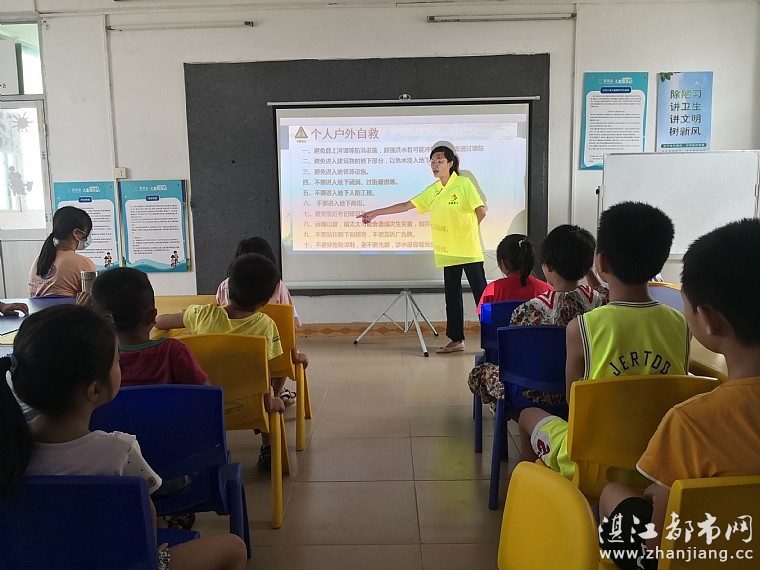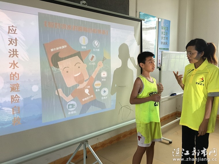 志愿者专职通过播放视频和PPT讲解,主要围绕“个人户外自救”和“居家自救”进行阐述,孩子们认识和了解了特大暴雨造成的灾害,从而认真学习应急措施来保护自身安全。