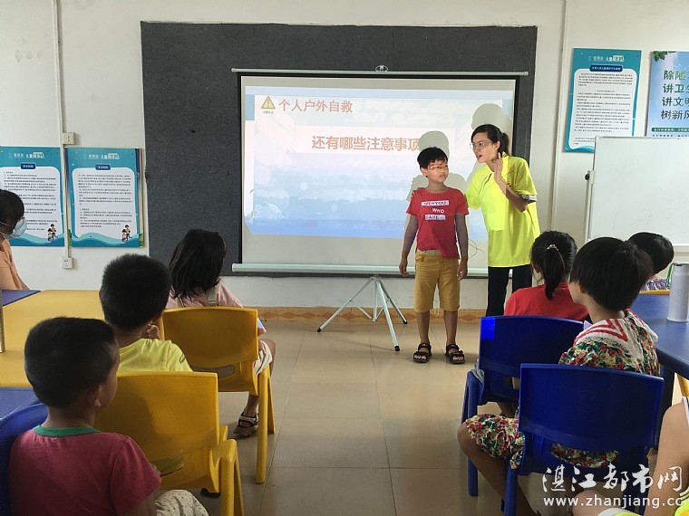 在志愿者专职播放视频和讲解PPT后,讲台交给了孩子们,孩子们纷纷举手表述自己学到的应急方法。
