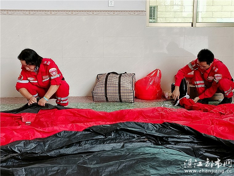 当天早上,下雨天气,情暖湛江志愿者、情暖湛江志愿应急救援队员一早冒雨集合,前往坡头区龙头镇山车村。众人到达后,即在山车村文化中心内搬运应急救援演示物资、搭建救灾帐篷和搭建消防逃生体验馆,做好实战演练的前期准备。