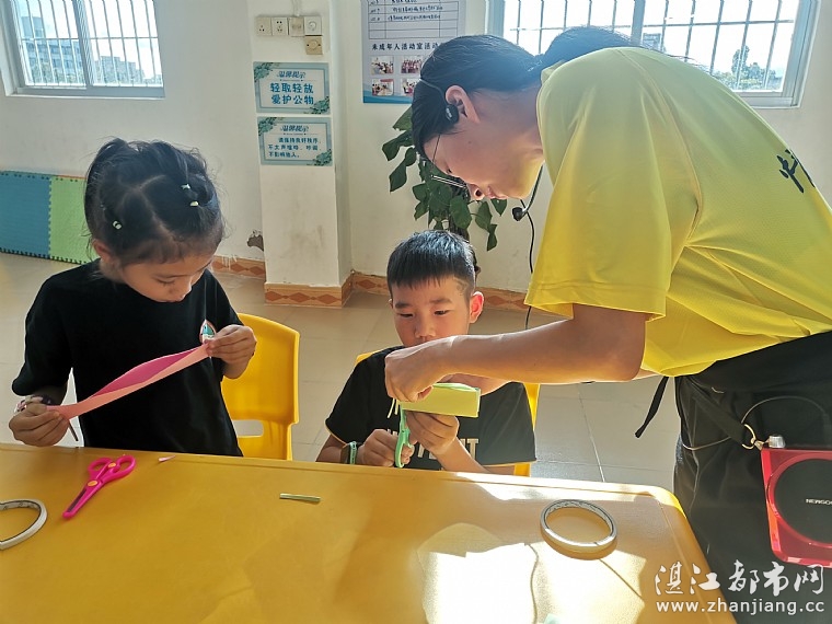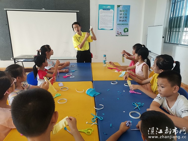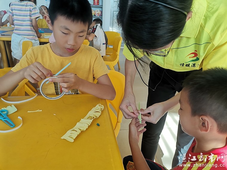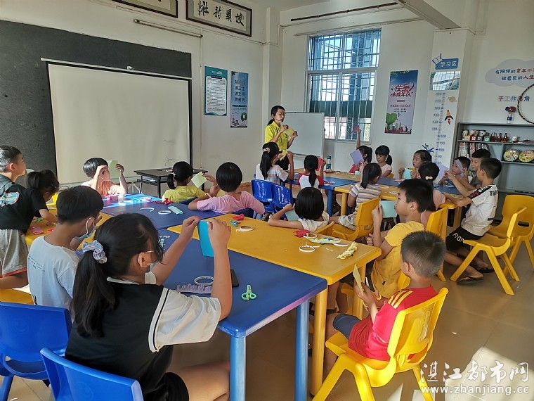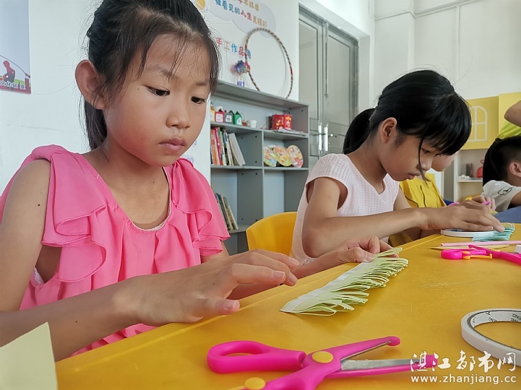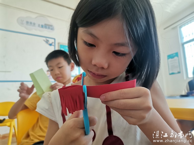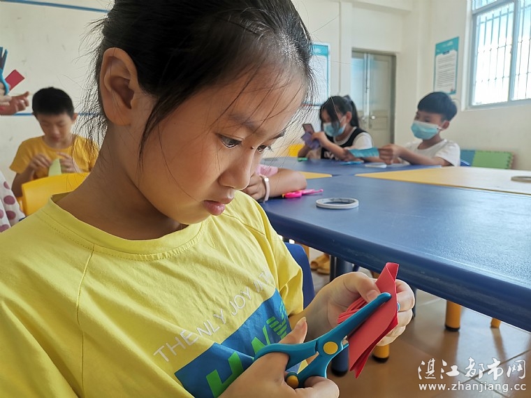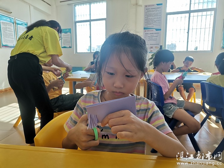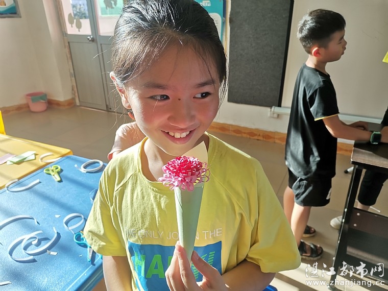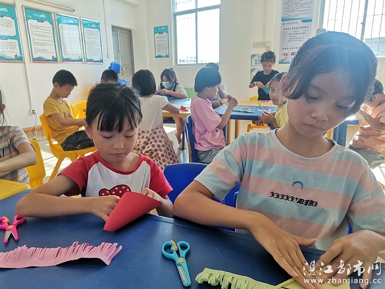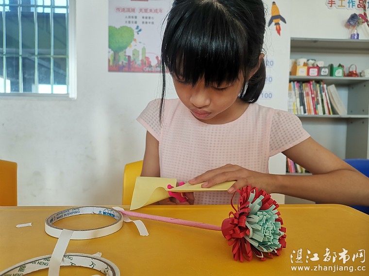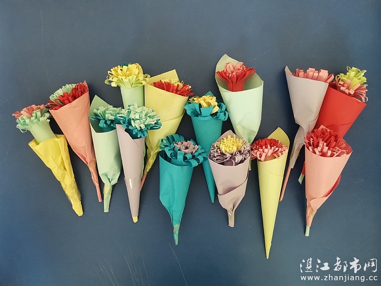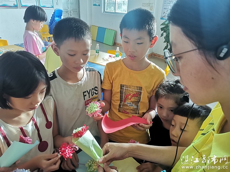 情暖湛江志愿者、坡头镇文化站专职人员带领孩子们学习制作手工花束。材料简单,实惠且容易准备,一把剪刀,一卷双面胶,几张卡纸加入一双巧手和一颗真挚的心。老师在讲台一步步操作,孩子们跟随着老师的步骤细心地裁剪着,粘贴着,年龄尚小的孩子也会呼喊老师进行手把手教导,整个教室充满着对新手工知识的渴望和一个个孩子们勤劳耐心的小身影。