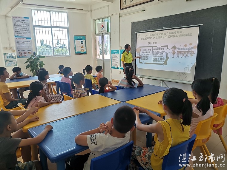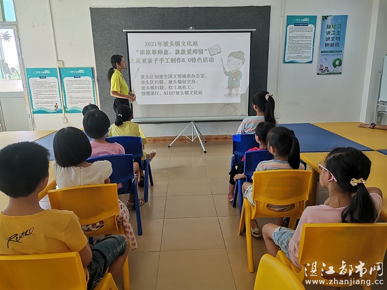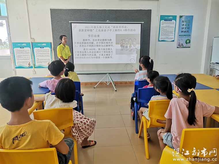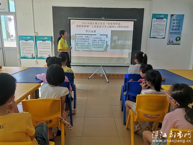 当天下午,情暖湛江志愿者、坡头镇文化站专职人员通过PPT授课方式,给孩子们普及了教师节的含义、演变历史、庆祝方式和节日影响,希望通过教师节知识的传播,让孩子们更加了解教师这个平凡而伟大的职业,培养孩子们从小尊师重教的美德以及给孩子们传播一种发自内心真诚且诚意满满的表达爱意的方式,如一句真心的祝福,一张温暖的卡片,一份亲手制作的手工,一首歌曲,一段舞蹈,一张温馨的手抄报,一幅画,一张进步的成绩单,这些真心的准备都远远胜过了世俗的“礼物”。