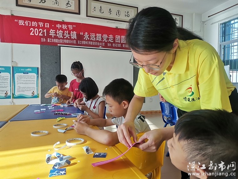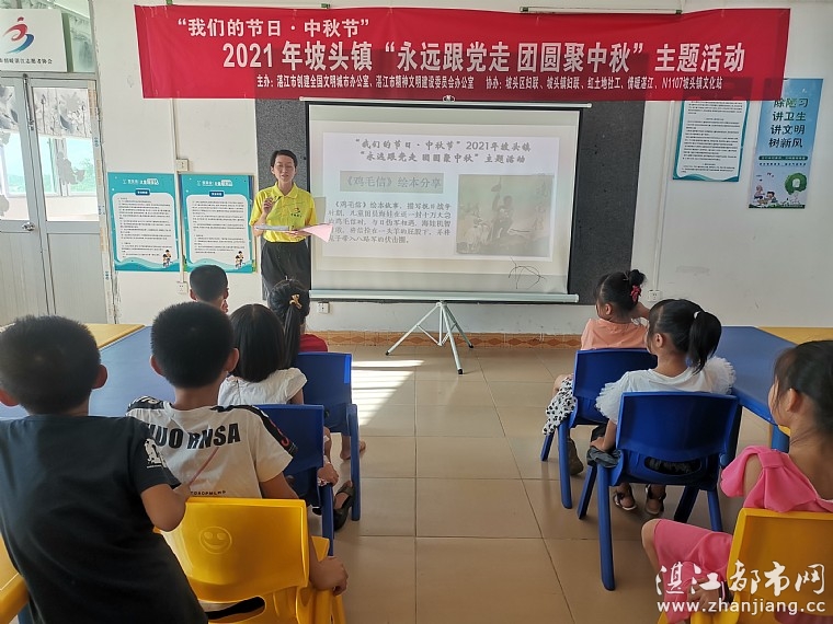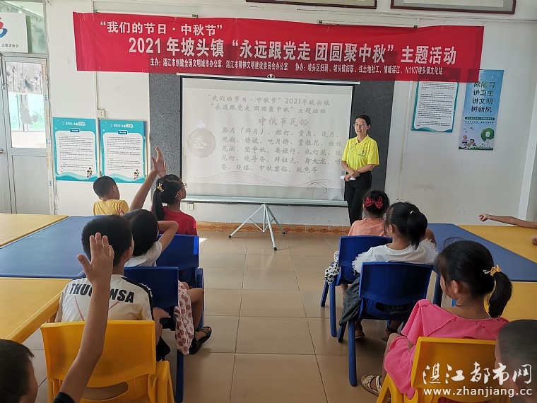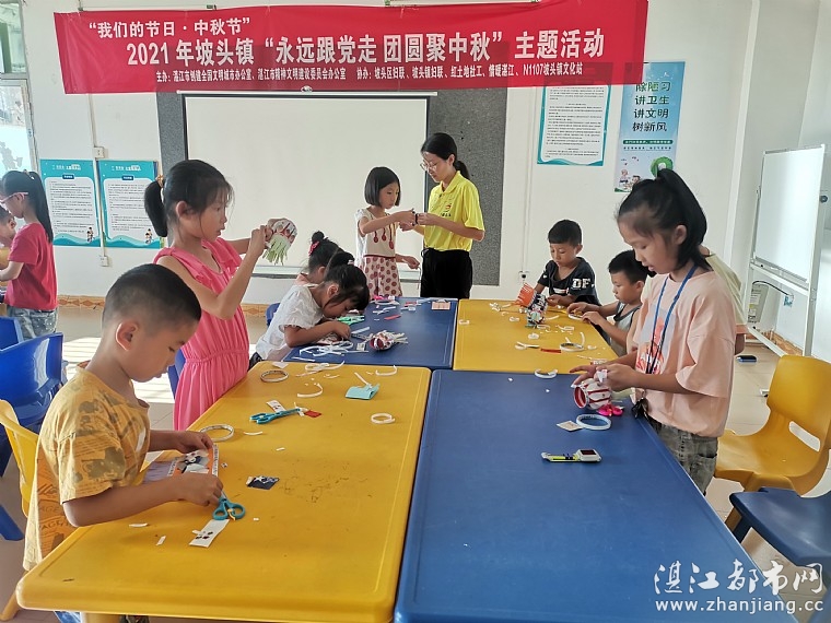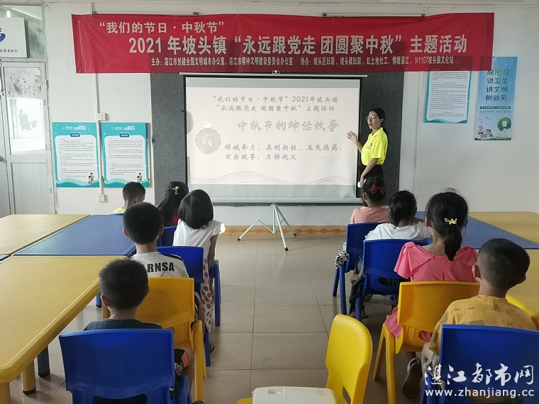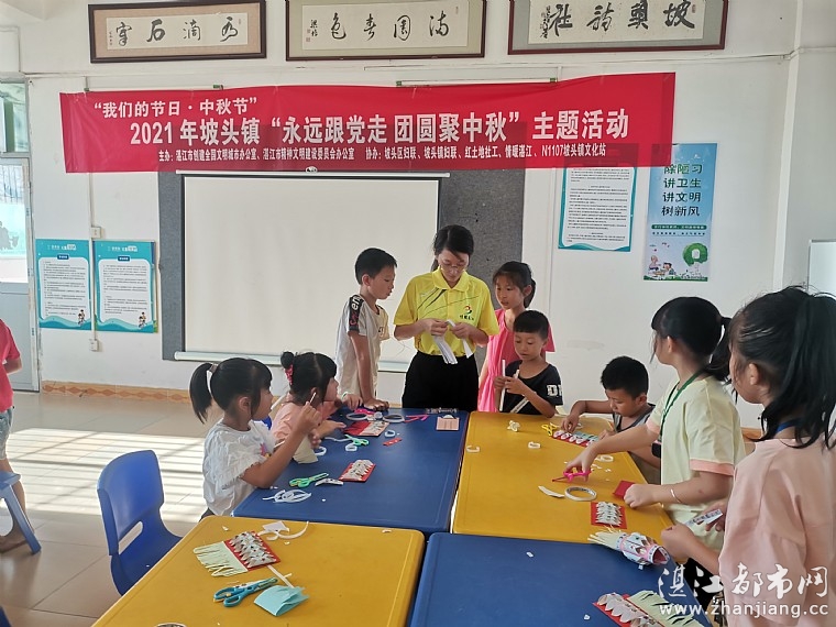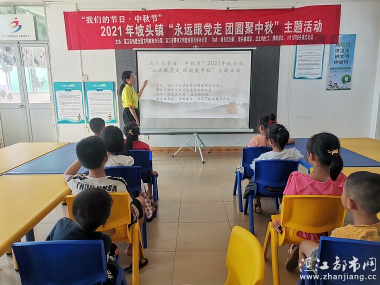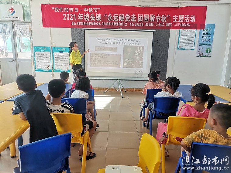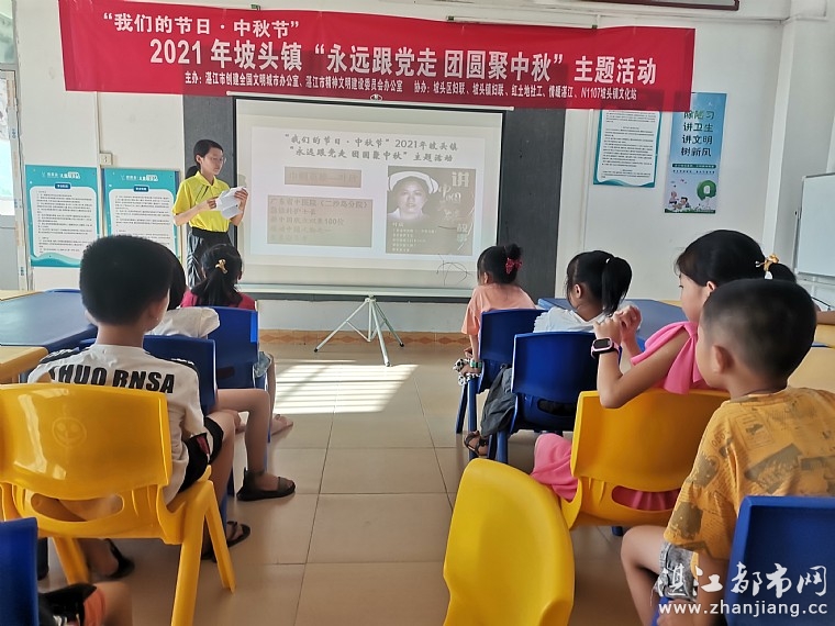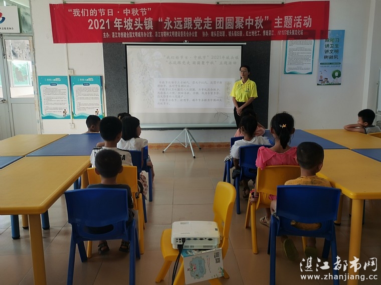 2021年9月19日(周日)下午湛江市创建全国文明城市办公室、湛江市精神文明建设委员会办公室、坡头区创建全国文明城市办公室、坡头区妇联、坡头镇创文办、坡头镇妇联、坡头镇文化站、湛江市红土地社会工作服务中心、湛江市情暖湛江志愿者协会和N1107壹基金儿童服务站(坡头镇文化站)联合开展“我们的节日·中秋节”2021年坡头镇“永远跟党走 团圆聚中秋”主题活动。儿童和家长30人在活动中受益。