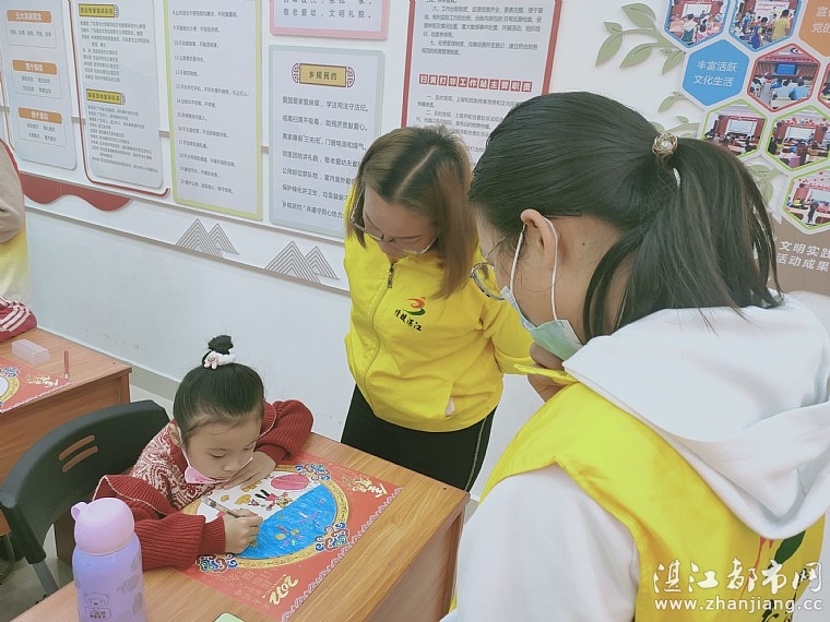 孩子们在志愿者们的指导下认真地构图、描线、上色。